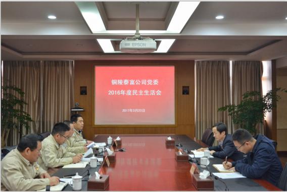 3月23日下午,铜陵泰富党委以贯彻党的十八届六中全会精神为主题,召开了2016年度民主生活会,公司党委班子成员参加会议,中特集团党委委员、组织部部长郏静洪,纪检监察部副部长邓新到会指导。 会议由铜陵泰富党委书记、总经理孙广亿主持。