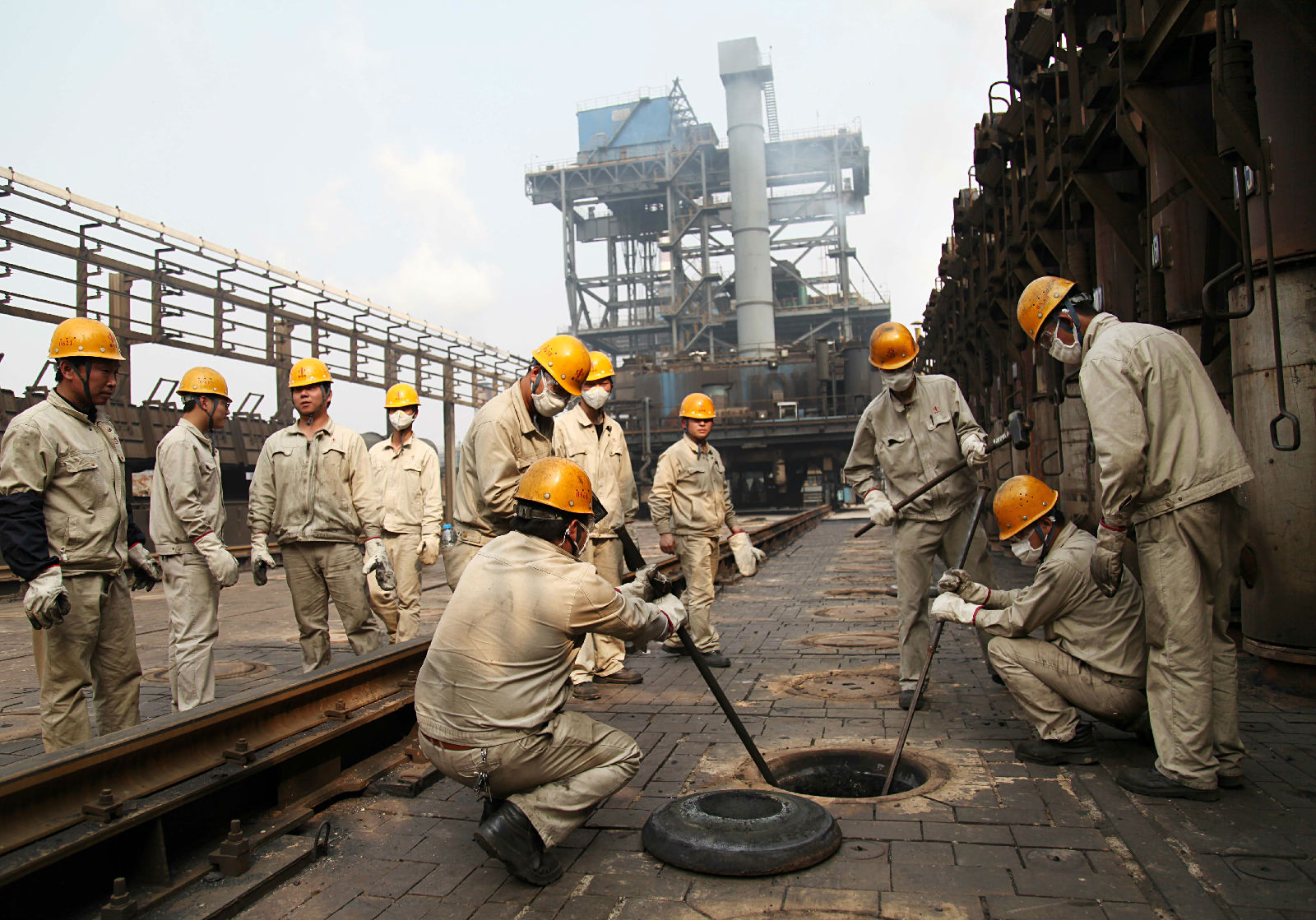 在铜陵新亚星焦化有限公司的焦炉炉顶,工人正在对炉口石墨进行清扫。春节期间,该公司加强安全生产调度,加大安全监督检查力度,确保节日期间安全生产。(记者 詹俊)